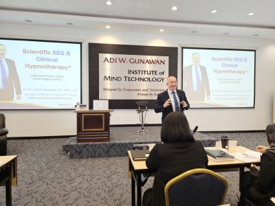 Adi W. Gunawan sedang melakukan live therapy disaksikan para peserta pelatihan Scientific EEG & Clinical Hypnotherapy (SECH). Masalah klien diselesaikan dalam satu sesi terapi yang berlangsung 3 jam 45 menit, menggunakan Quantum Hypnotherapeutic Protocol, Dual Layer Therapy.)